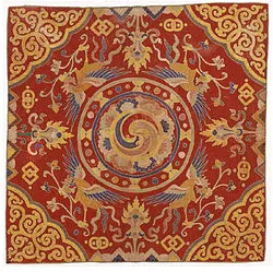 A thrikhep (throne cover) from the 19th century. Throne covers were placed atop the temple cushions used by high lamas. The central circular swirling quadrune is the gankyil in its mode as the "Four Joys".